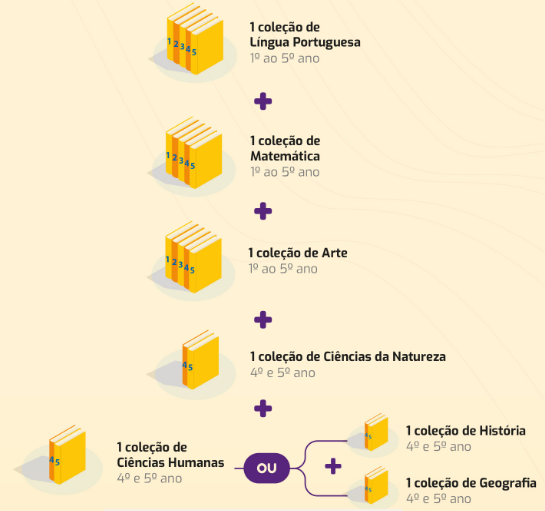 • Já para Arte e Educação Física, a escola poderá optar por uma coleção que contempla Arte e Educação Física (1° ao 5° ano), acompanhando + dois volumes de Educação Física somente para professor OU uma coleção de Arte (1° ao 5° ano) + uma coleção de Educação Física em dois volumes, somente para o professor.