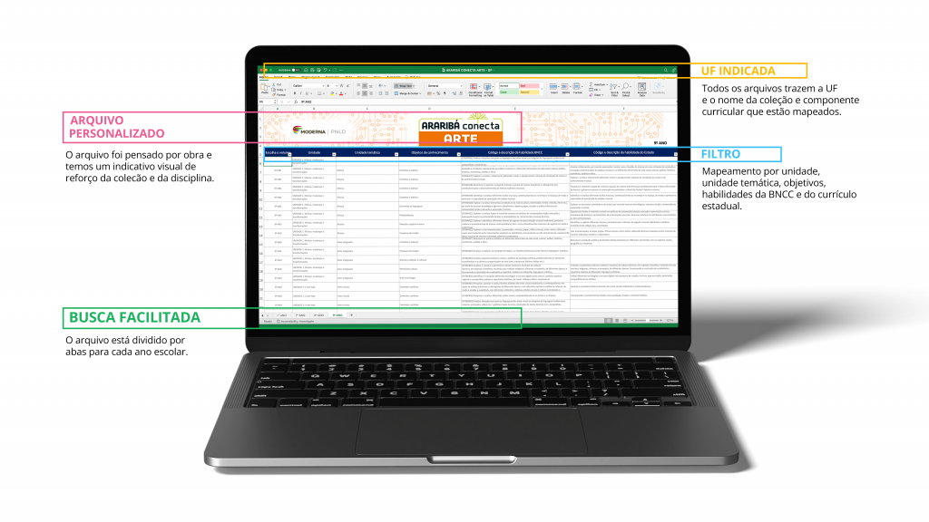 Para facilitar o trabalho da equipe docente durante a análise do material, a planilha traz seis abas diferentes: consolidado (com todos os anos escolares, unidades temáticas, códigos previstos na BNCC e as habilidades exigidas no currículo do estado) e com as informações filtradas ano a ano.